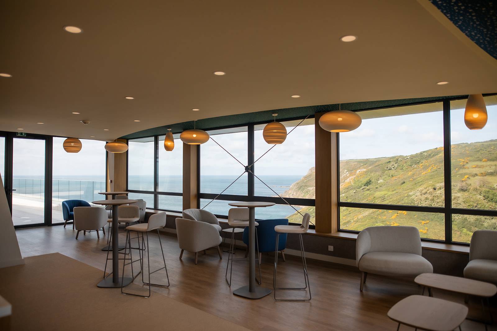 Le restaurant offre l’une des plus belles vues de la région : mer, falaises et lumière naturelle. Nous devions proposer un mobilier pratique et élégant sans dépasser le budget global.