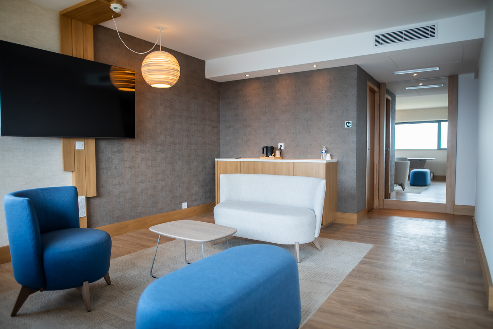 Le hall est le premier espace que découvre le visiteur. Nous avons donc imaginé une ambiance accueillante et élégante, en concevant des galettes d’assises sur mesure fixées par Velcro. Les canapés et fauteuils Thalia de chez Mobitec ont été sélectionnés pour leur confort et leur esthétique intemporelle.